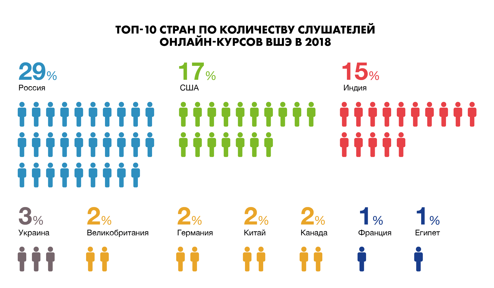 В 2018 году на курсы ВШЭ зарегистрировались слушатели из 195 стран. Больше всего регистраций из России, США и Индии.